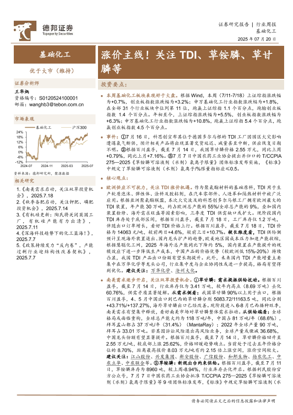【德邦证券】【20250720】基础化工行业周报:涨价主线!关注TDI、草铵膦、草甘膦等-43页