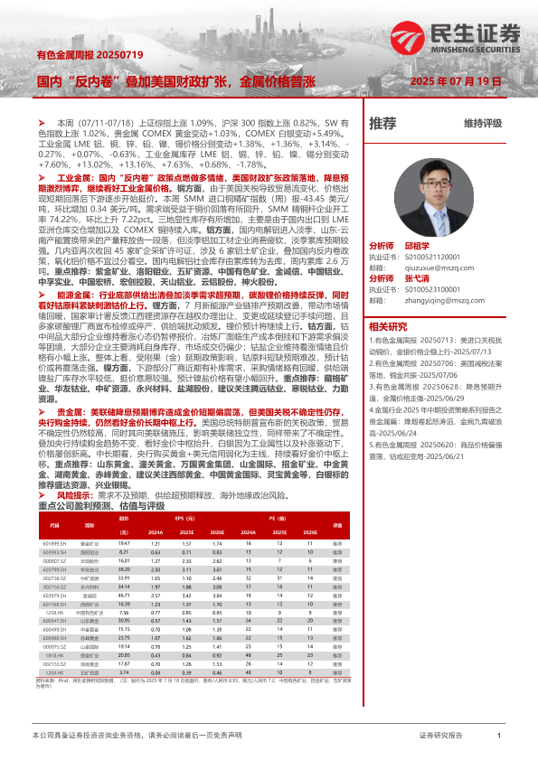 【民生证券】【20250719】有色金属周报:国内“反内卷”叠加美国财政扩张,金属价格普涨-29页