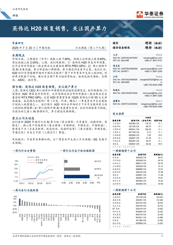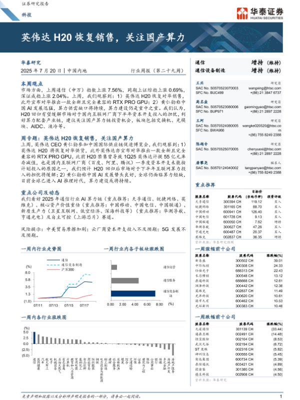 【华泰证券】【20250720】科技行业周报(第二十九周):英伟达H20恢复销售,关注国产算力-13页