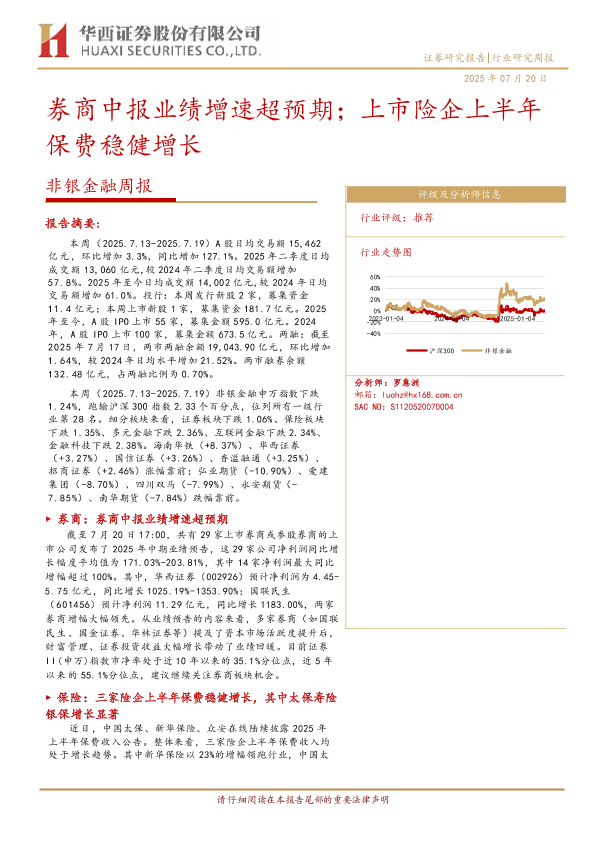 【华西证券】【20250720】非银金融周报:券商中报业绩增速超预期;上市险企上半年保费稳健增长-10页