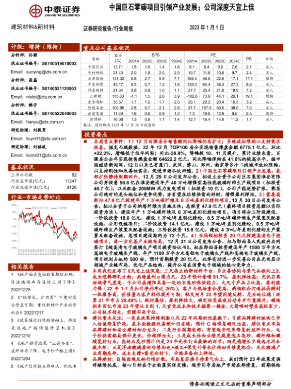 【中泰证券】【20230101】建筑材料&新材料行业周报:中国巨石零碳项目引领产业发展;公司深度天宜上佳-25页