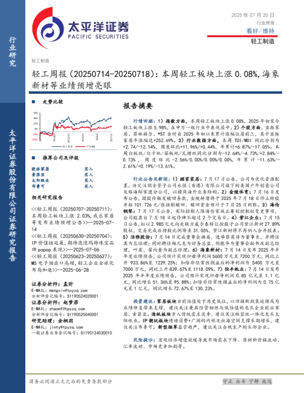 【太平洋证券】【20250720】轻工行业周报:本周轻工板块上涨0.08%,海象新材等业绩预增亮眼-14页