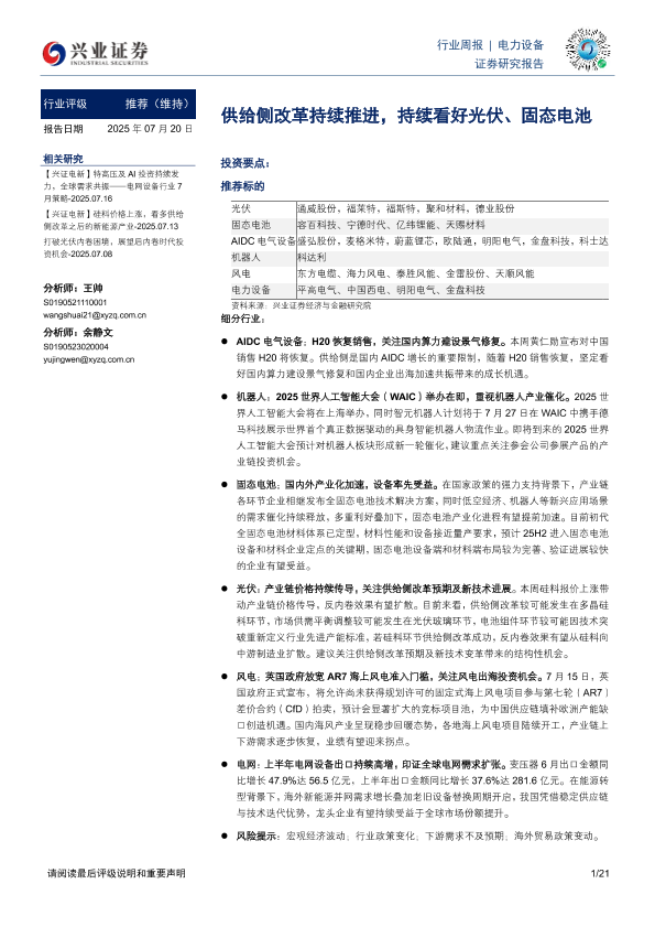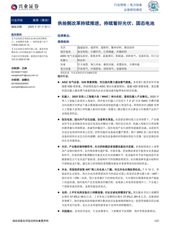 【兴业证券】【20250720】电力设备行业周报:供给侧改革持续推进,持续看好光伏、固态电池-21页