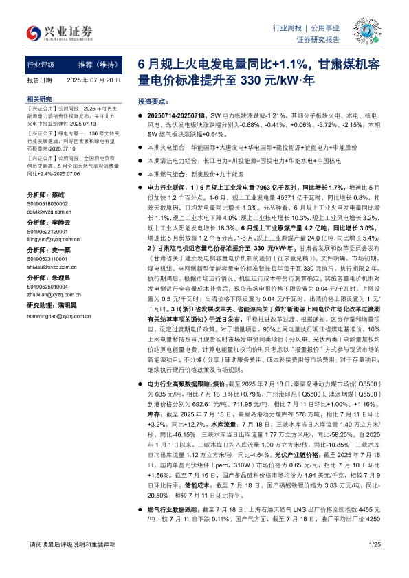 【兴业证券】【20250720】公用事业行业周报:6月规上火电发电量同比+1.1%,甘肃煤机容量电价标准提升至330元 kW·年-25页