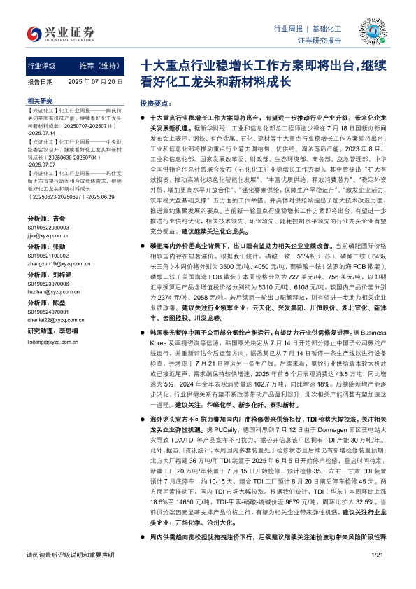 【兴业证券】【20250720】基础化工行业周报:十大重点行业稳增长工作方案即将出台,继续看好化工龙头和新材料成长-21页