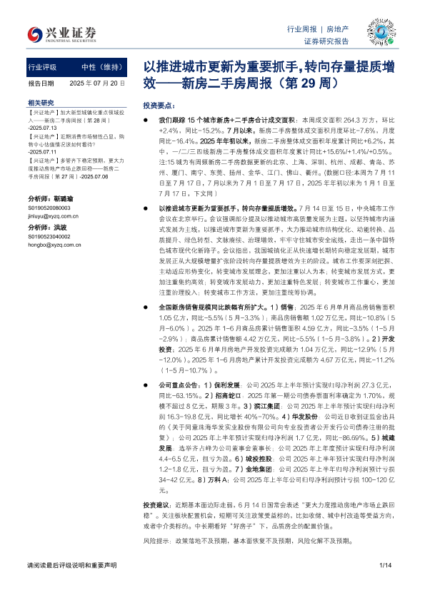 【兴业证券】【20250720】新房二手房周报(第29周):以推进城市更新为重要抓手,转向存量提质增效-14页