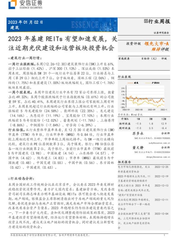 【安信证券】【20230102】建筑行业周报:2023年基建REITs有望加速发展,关注近期光伏建设和运营板块投资机会-14页