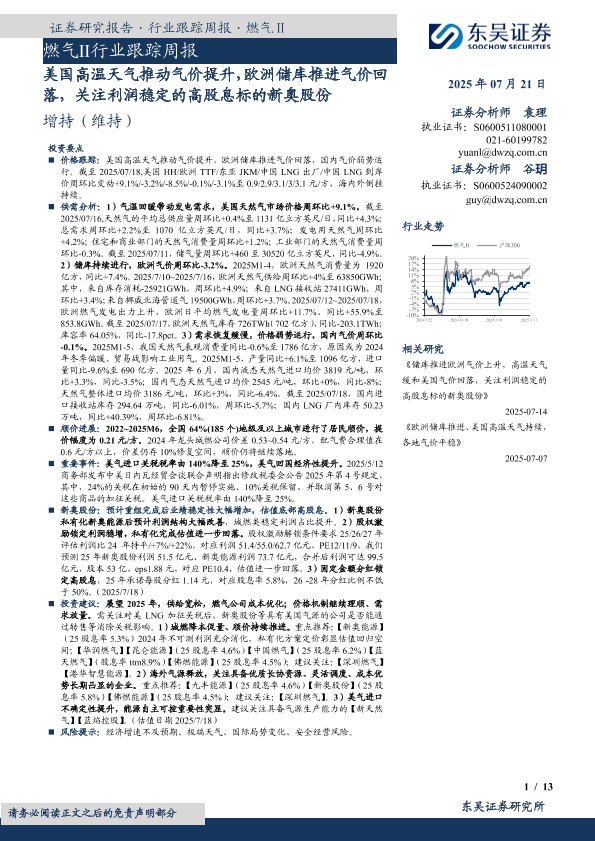【东吴证券】【20250721】燃气Ⅱ行业跟踪周报:美国高温天气推动气价提升,欧洲储库推进气价回落,关注利润稳定的高股息标的新奥股份-13页