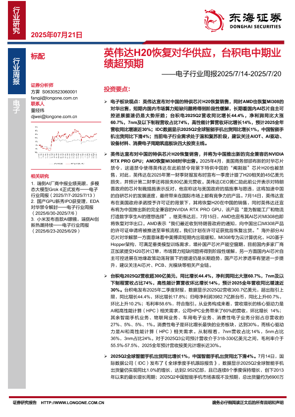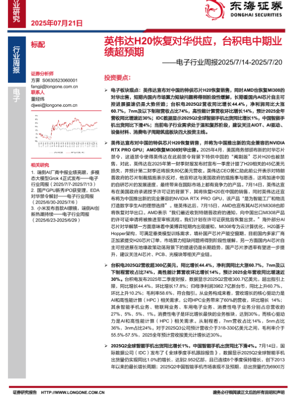【东海证券】【20250721】英伟达H20恢复对华供应,台积电中期业绩超预期-15页