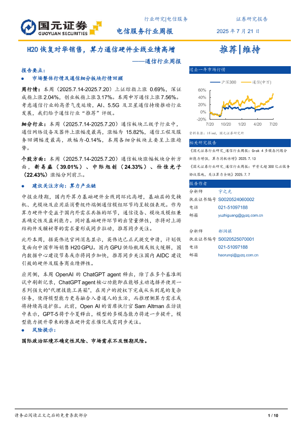 【国元证券】【20250721】通信行业周报:H20恢复对华销售,算力通信硬件全线业绩高增-10页