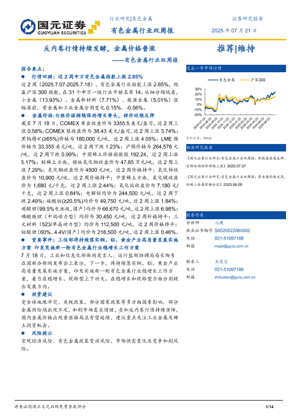 【国元证券】【20250721】有色金属行业双周报:反内卷行情持续发酵,金属价格普涨-14页