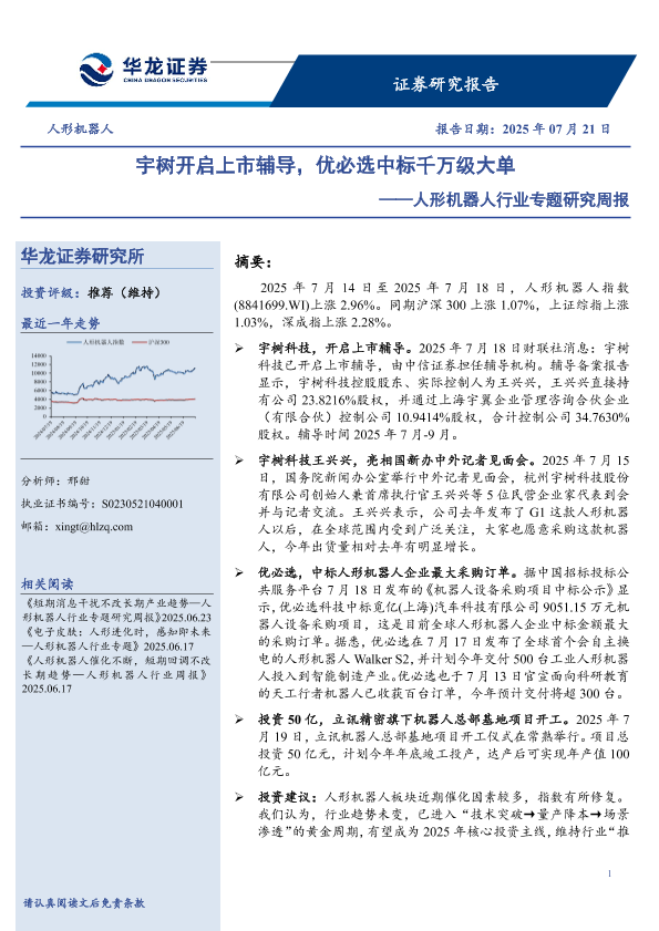 【华龙证券】【20250721】人形机器人行业专题研究周报:宇树开启上市辅导,优必选中标千万级大单-10页