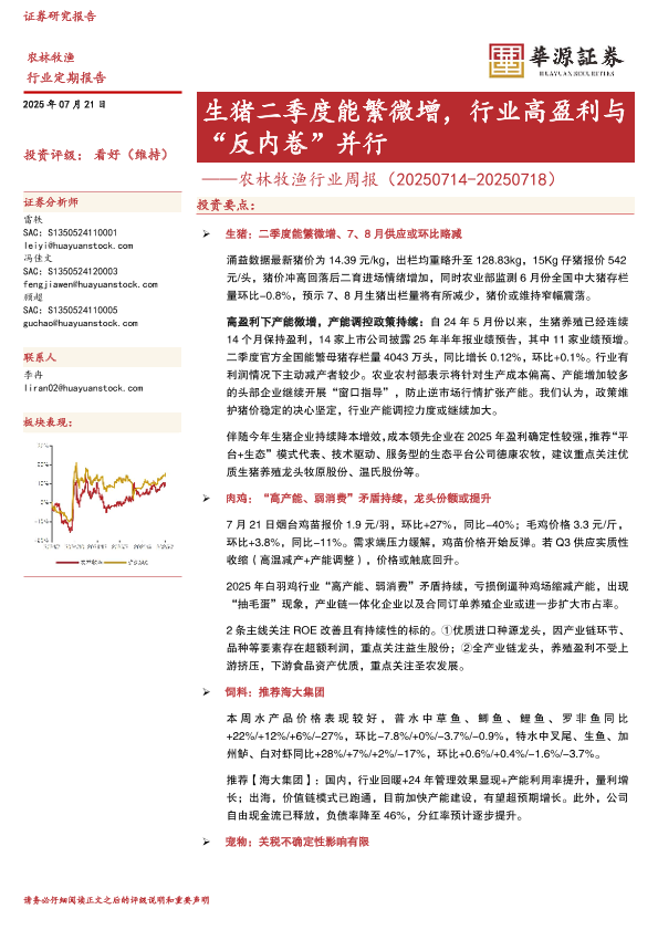 【华源证券】【20250721】农林牧渔行业周报:生猪二季度能繁微增,行业高盈利与“反内卷”并行-16页