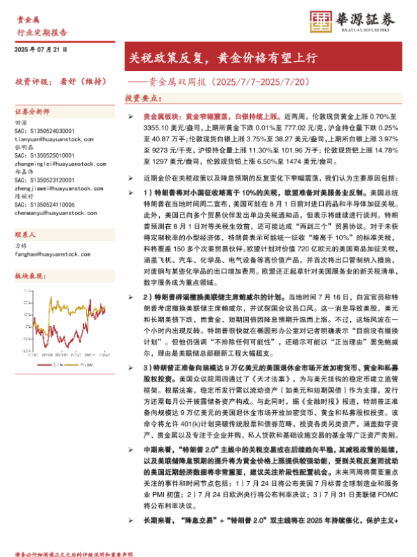 【华源证券】【20250721】贵金属双周报:关税政策反复,黄金价格有望上行-12页