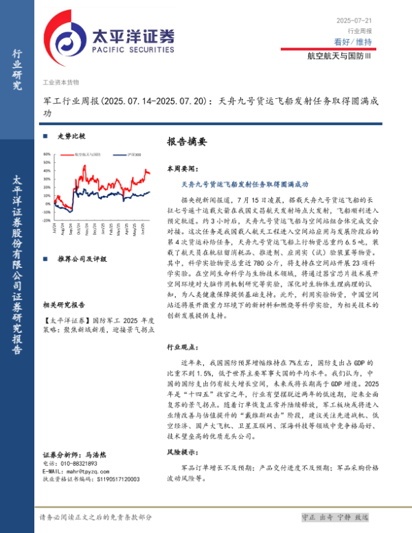 【太平洋证券】【20250721】军工行业周报:天舟九号货运飞船发射任务取得圆满成功-13页