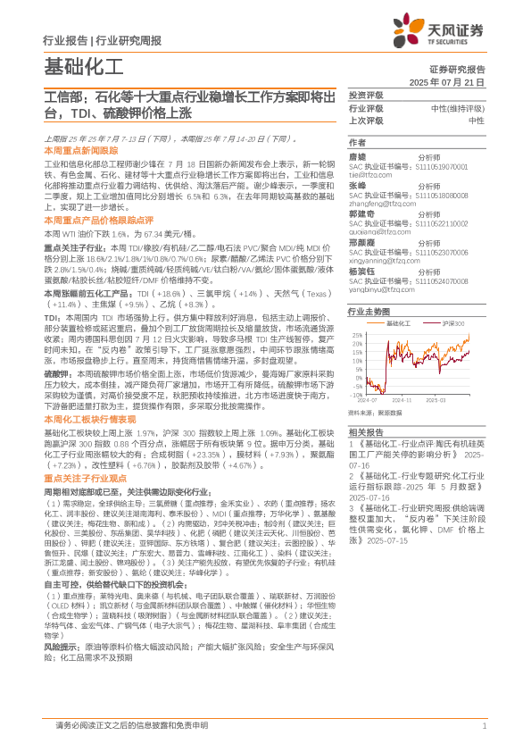 【天风证券】【20250721】基础化工行业工信部:石化等十大重点行业稳增长工作方案即将出台,TDI、硫酸钾价格上涨-21页