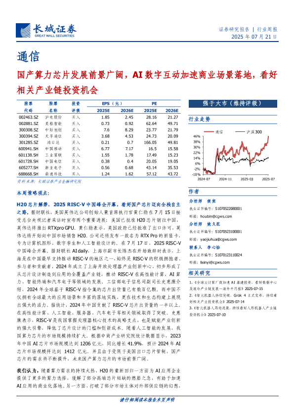 【长城证券】【20250721】通信行业周报:国产算力芯片发展前景广阔,AI数字互动加速商业场景落地-18页