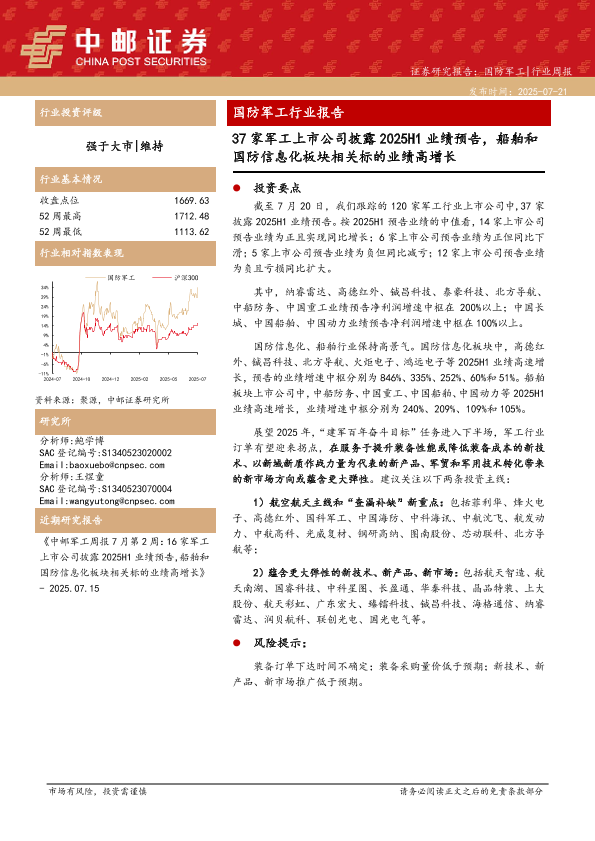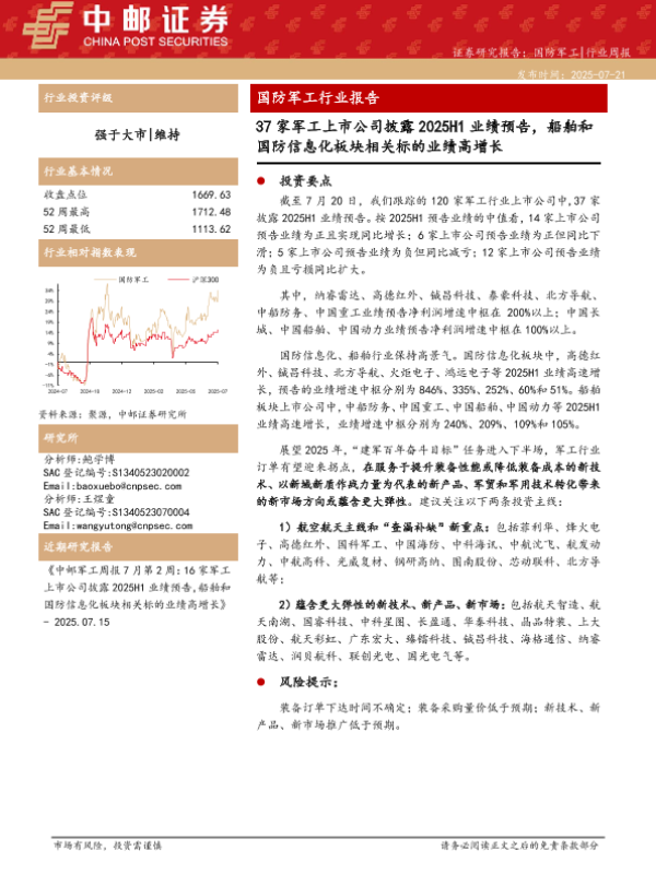 【中邮证券】【20250721】国防军工行业报告:37家军工上市公司披露2025H1业绩预告,船舶和国防信息化板块相关标的业绩高增长-14页