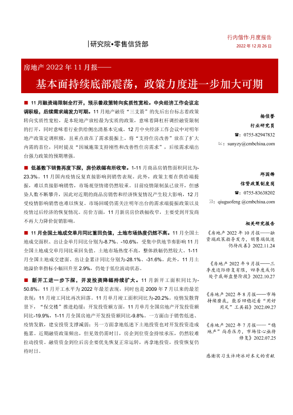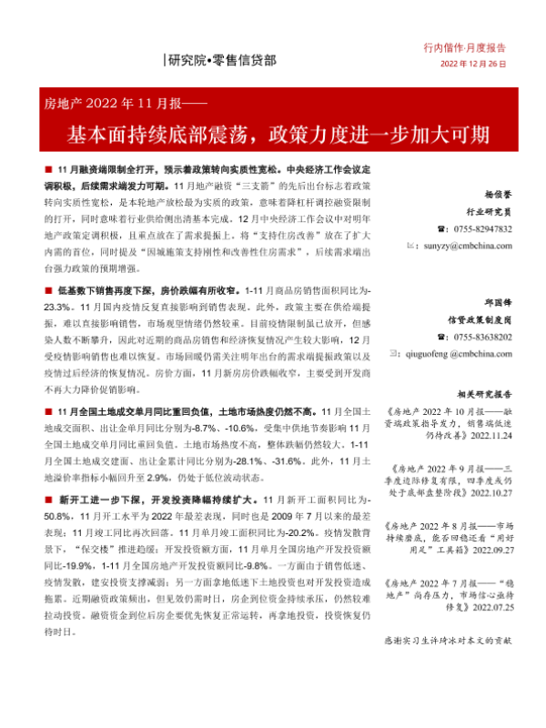 【招商银行】【20221226】房地产行业2022年11月报:基本面持续底部震荡,政策力度进一步加大可期-20页