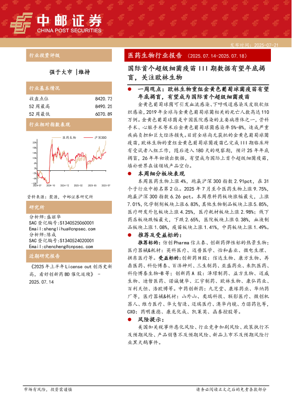 【中邮证券】【20250721】医药生物行业报告:国际首个超级细菌疫苗III期数据有望年底揭盲,关注欧林生物-15页