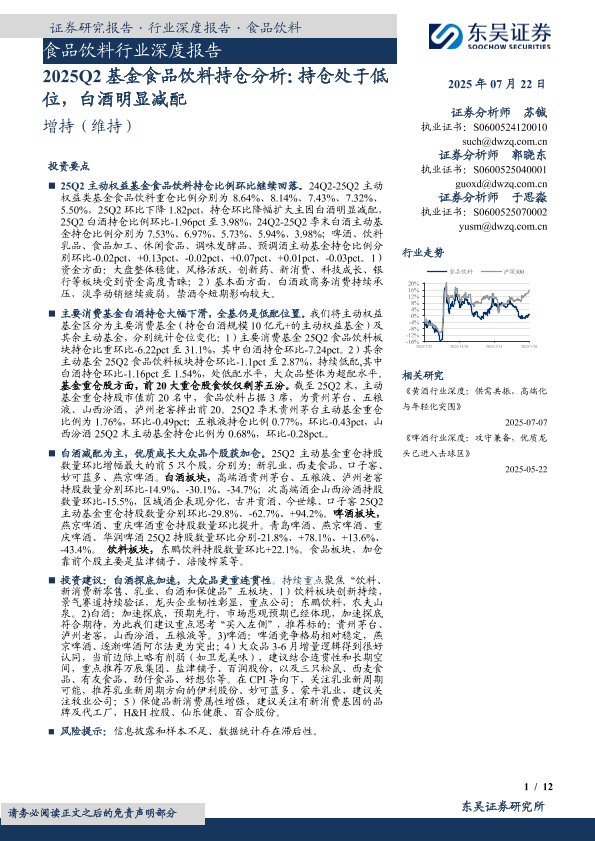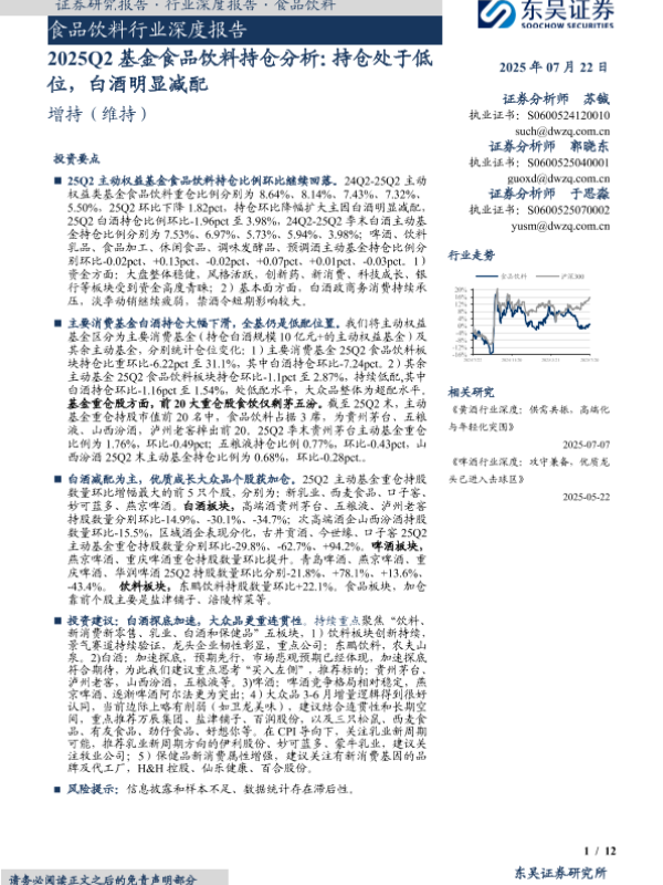 【东吴证券】【20250722】2025Q2基金食品饮料持仓分析:持仓处于低位,白酒明显减配-12页