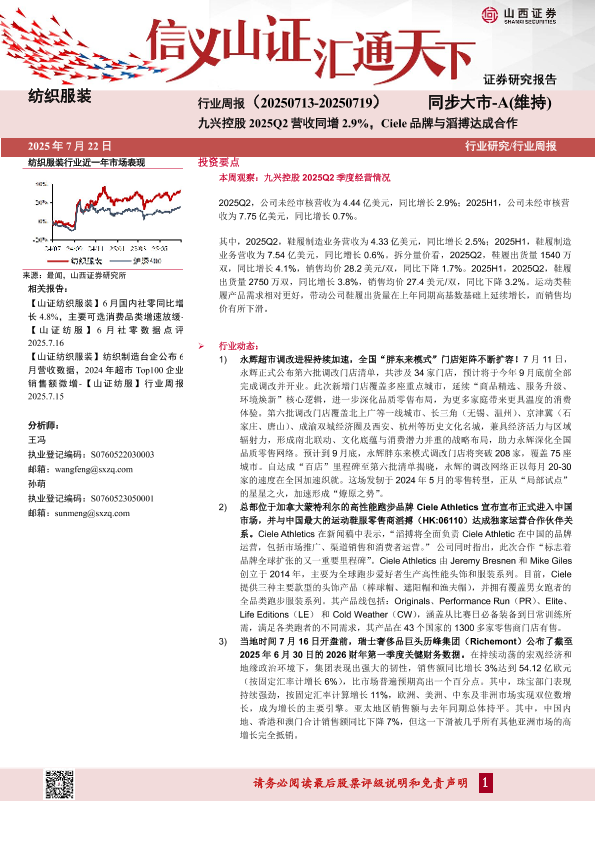 【山西证券】【20250722】纺织服装行业周报:九兴控股2025Q2营收同增2.9%,Ciele品牌与滔搏达成合作-17页