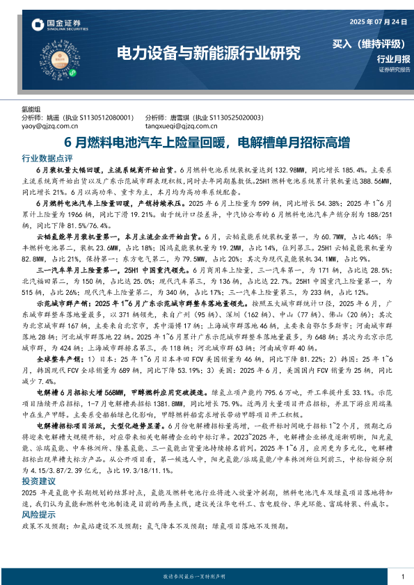 【国金证券】【20250724】6月燃料电池汽车上险量回暖,电解槽单月招标高增-19页