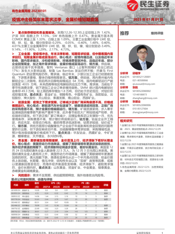 【民生证券】【20230101】有色金属周报:疫情冲击叠加年末需求淡季,金属价格短期震荡-26页