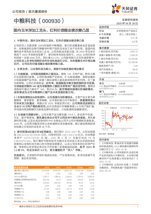 【天风证券】【20250628】中粮科技(000930)国内玉米深加工龙头,红利价值随业绩改善凸显-17页