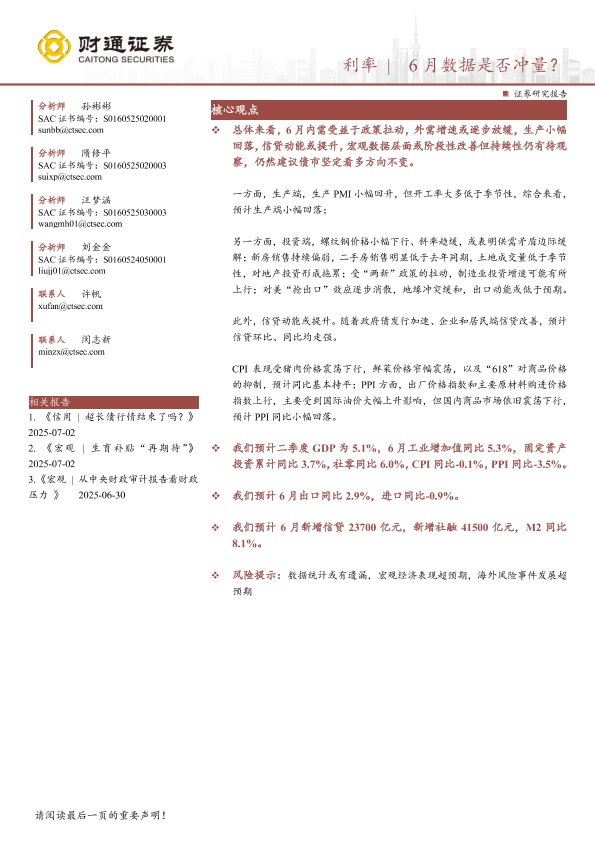 宏观经济 信贷市场 经济指标 6月数据预测 利率分析