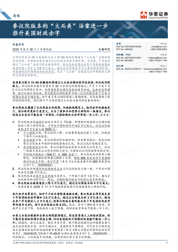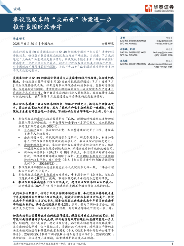 【华泰证券】【20250630】宏观专题研究:参议院版本的“大而美”法案进一步推升美国财政赤字-10页