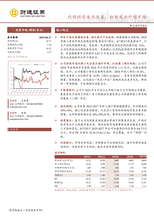 外销市场 内销市场 并购 盈利预测 小熊电器