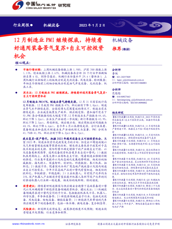【银河证券】【20230102】机械行业周报:12月制造业PMI继续探底,持续看好通用装备景气复苏+自主可控投资机会-21页