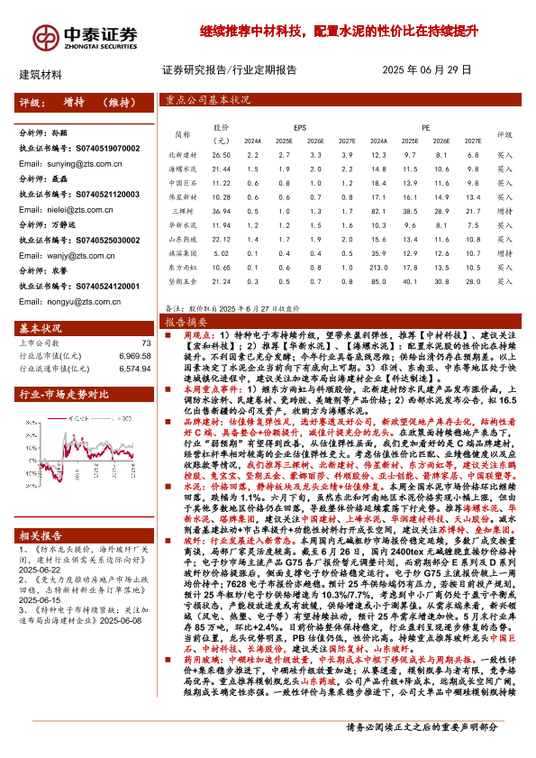【中泰证券】【20250629】建筑材料行业:继续推荐中材科技,配置水泥的性价比在持续提升-19页