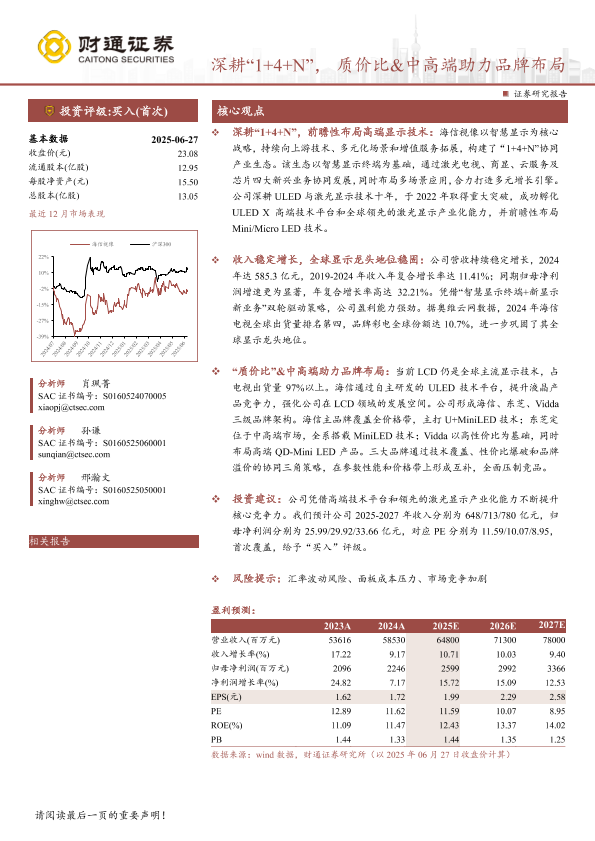 中高端市场 1+4+N战略 显示技术 海信视像 质价比
