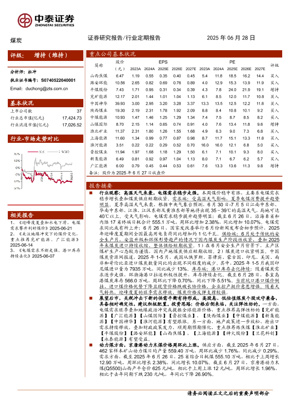 【中泰证券】【20250628】煤炭行业:夏季高温带动电煤需求增长,煤价反弹支撑较强关注弹性-23页