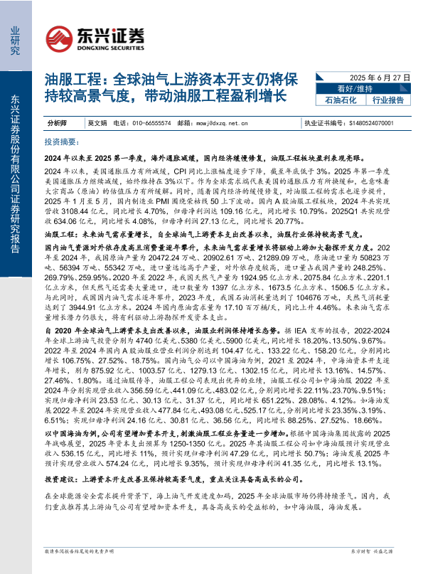 【东兴证券】【20250627】石油石化行业油服工程:全球油气上游资本开支仍将保持较高景气度,带动油服工程盈利增长-11页