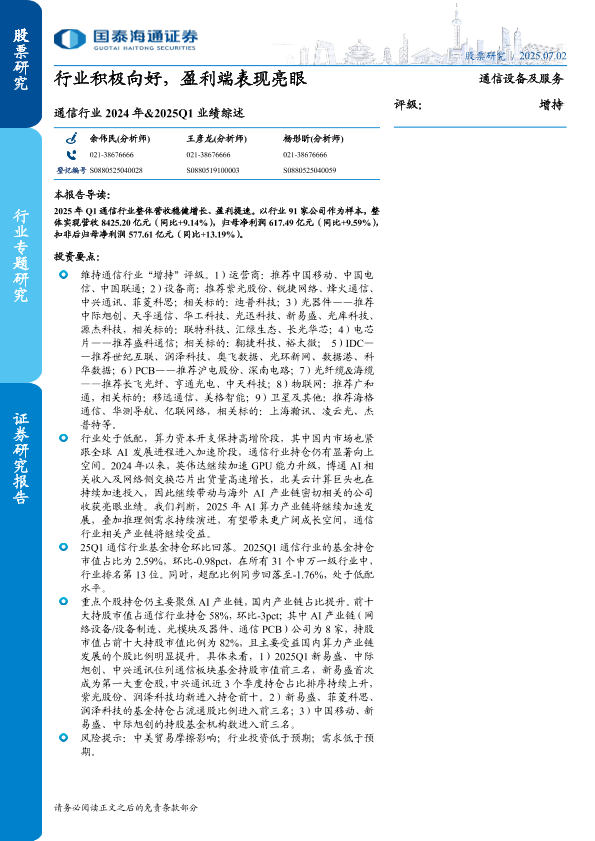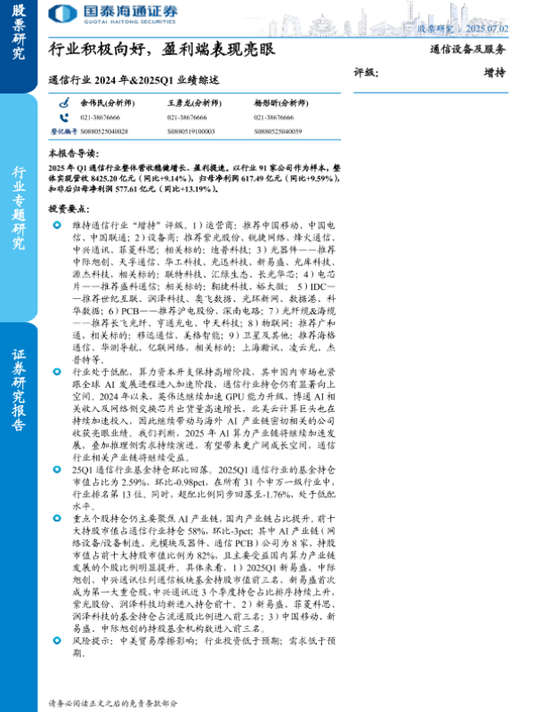 【国泰海通证券】【20250702】通信行业2024年&2025Q1业绩综述:行业积极向好,盈利端表现亮眼-18页