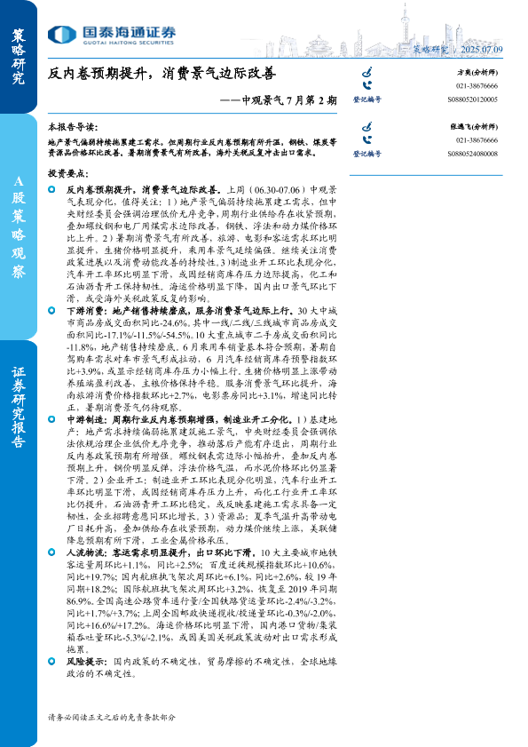 【国泰海通证券】【20250709】中观景气7月第2期:反内卷预期提升,消费景气边际改善-11页