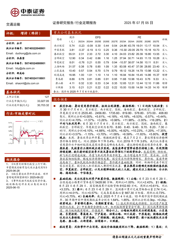 【中泰证券】【20250705】交通运输行业:暑运升温有望提振航空,促消费政策下关注快递-24页