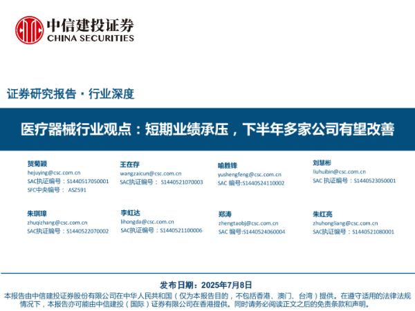 【中信建投证券】【20250708】医疗器械行业观点:短期业绩承压,下半年多家公司有望改善-55页