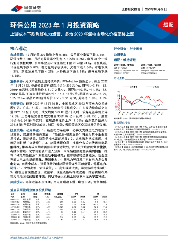 【国信证券】【20230102】环保公用2023年1月投资策略:上游成本下跌利好电力运营,多地2023年煤电市场化价格顶格上涨-30页