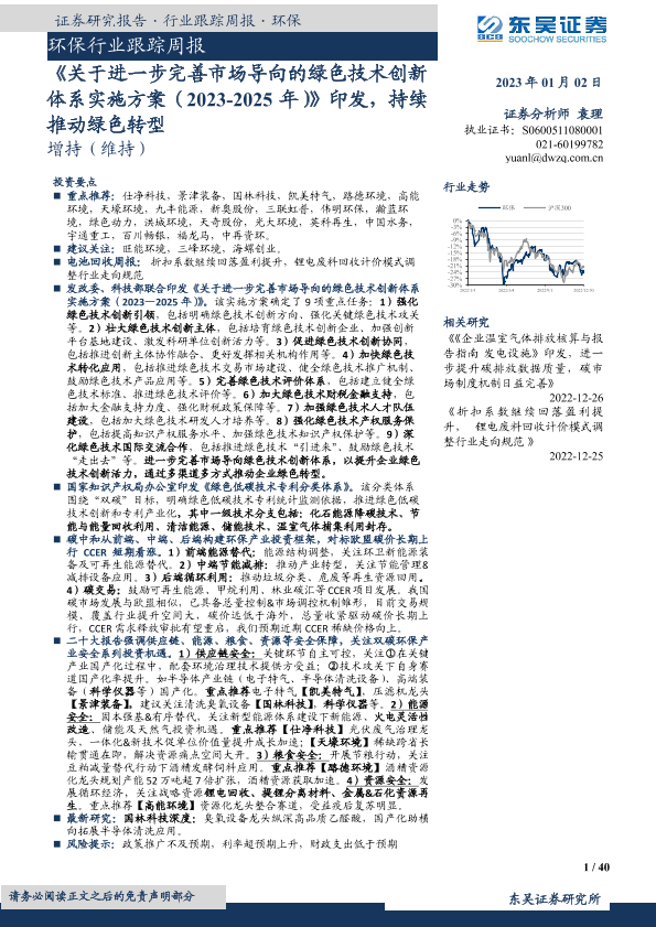 【东吴证券】【20230102】环保行业跟踪周报:《关于进一步完善市场导向的绿色技术创新体系实施方案(2023-2025年)》印发,持续推动绿色转型-40页