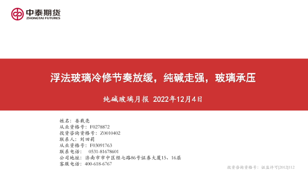 【中泰期货】【20221204】玻璃纯碱月报:浮法玻璃冷修节奏放缓,纯碱走强,玻璃承压-26页