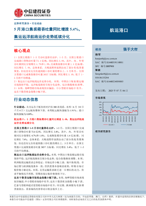 【中信建投证券】【20250706】航运港口行业:5月港口集装箱吞吐量同比增速5.4%,集运远洋航线运价走势延续分化-22页