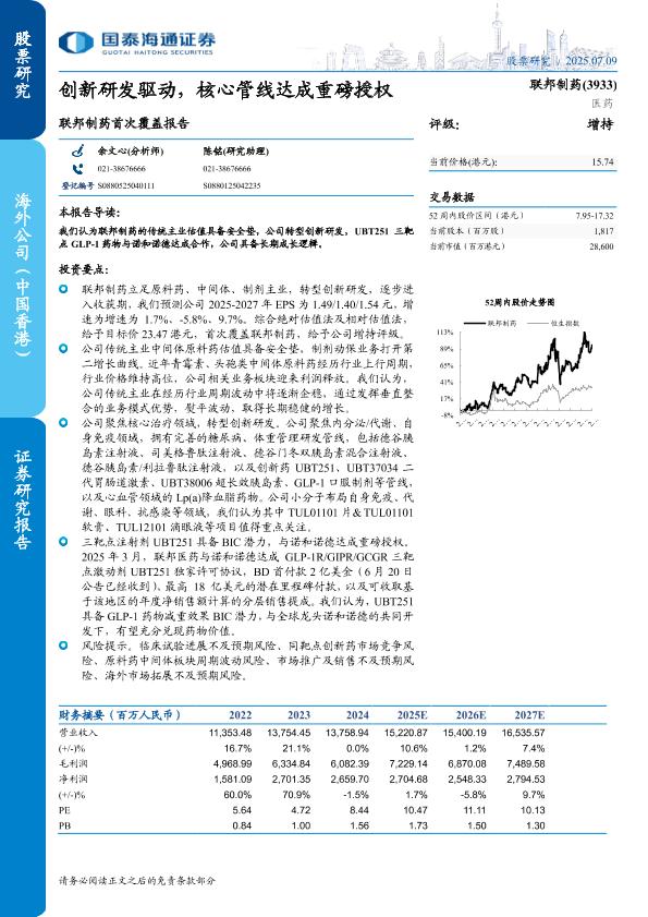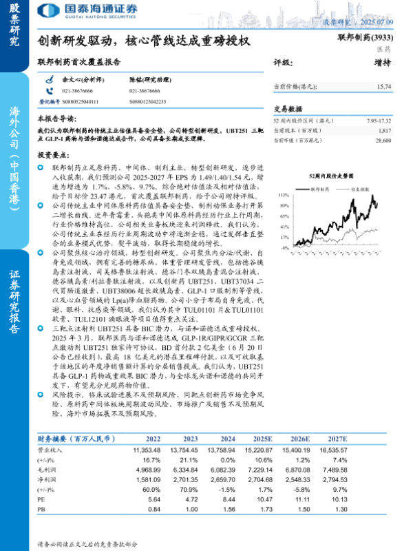 【国泰海通证券】【20250709】联邦制药首次覆盖报告:创新研发驱动,核心管线达成重磅授权-23页
