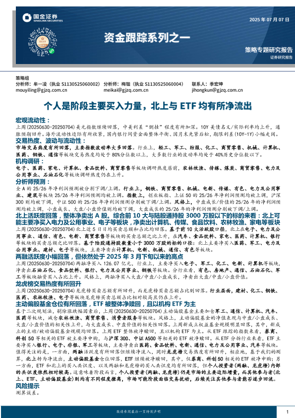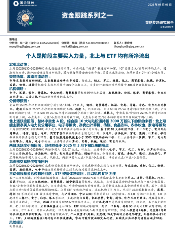 【国金证券】【20250707】资金跟踪系列之一:个人是阶段主要买入力量,北上与ETF均有所净流出-42页