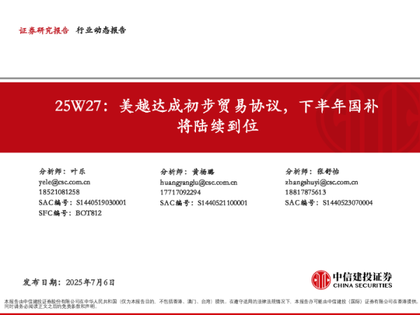 【中信建投证券】【20250706】轻工行业25W27:美越达成初步贸易协议,下半年国补将陆续到位-48页