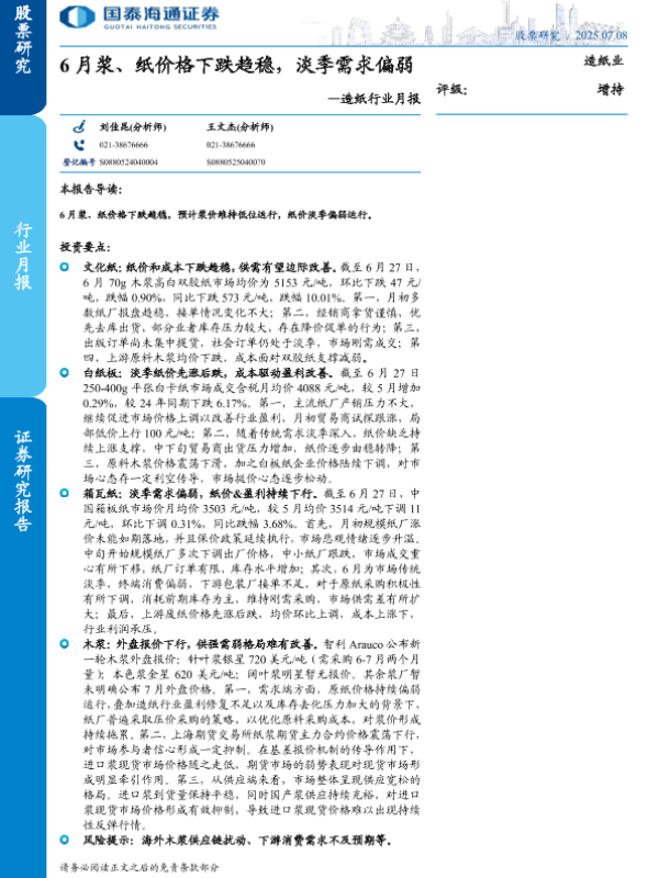 【国泰海通证券】【20250708】造纸行业月报:6月浆、纸价格下跌趋稳,淡季需求偏弱-22页