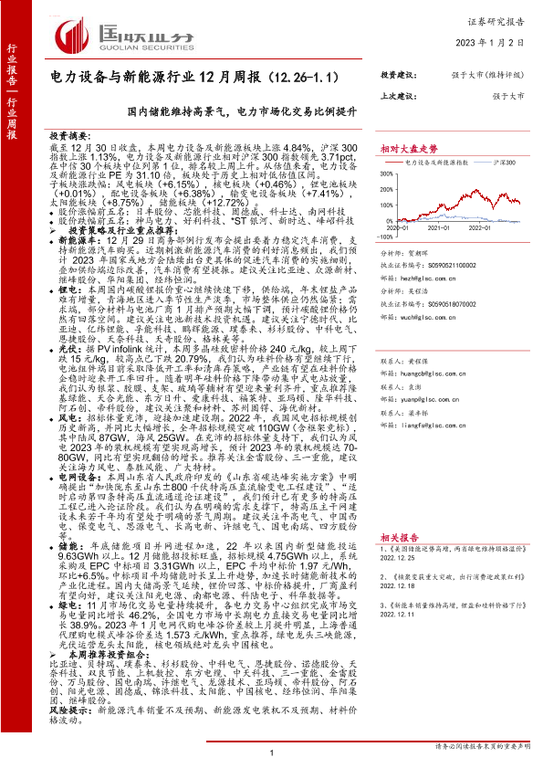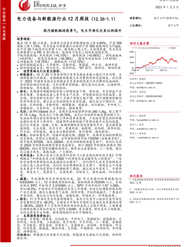【国联证券】【20230102】电力设备与新能源行业12月周报:国内储能维持高景气,电力市场化交易比例提升-20页